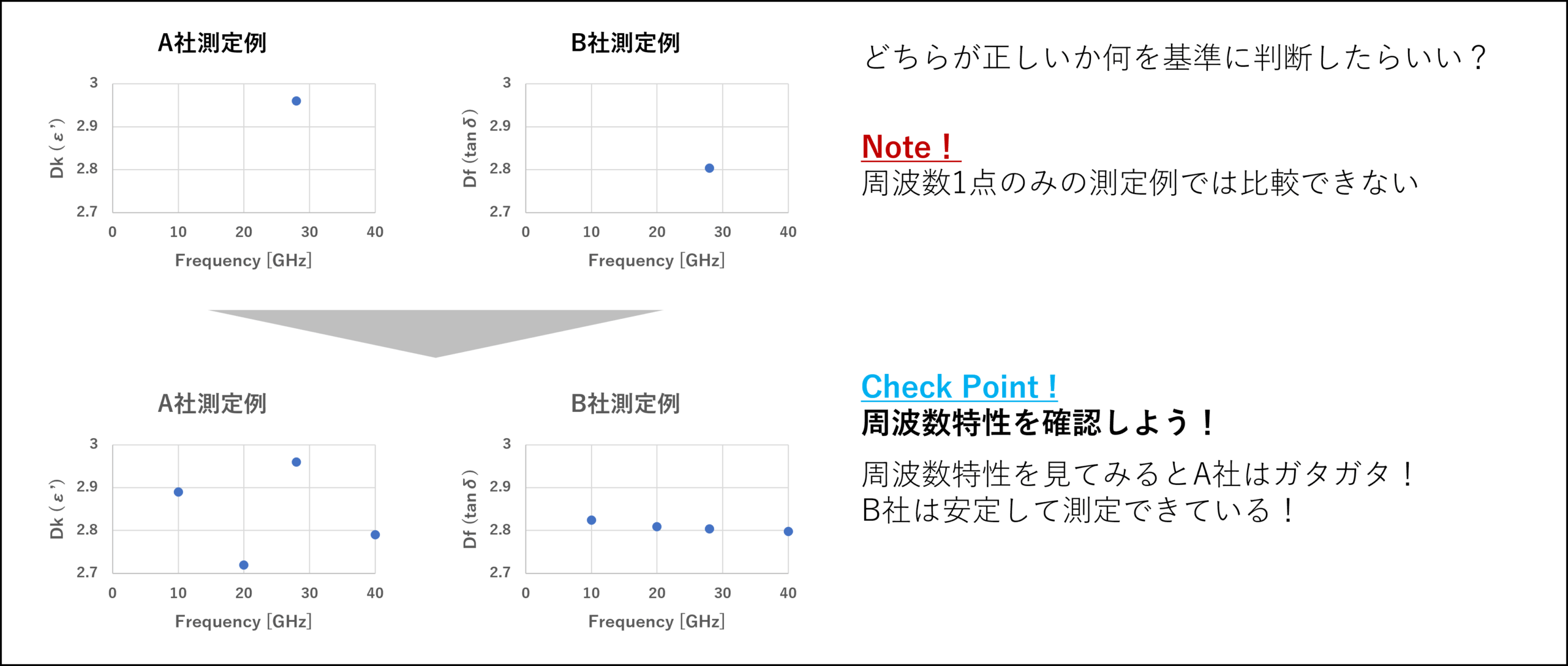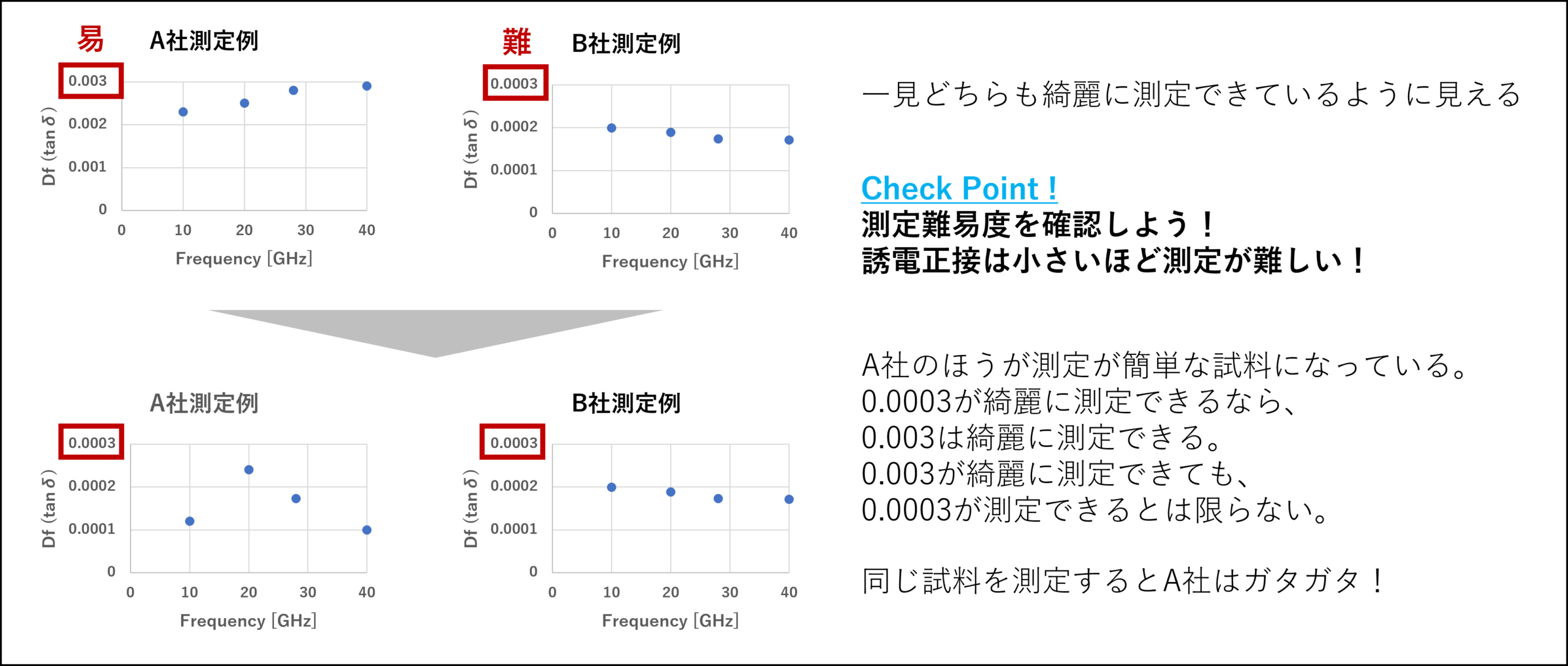 どちらもきれいに測定できているように見えますが、B社のほうが誘電正接が一桁小さい素材を測定しており、実はこの測定難易度には天と地ほどの差があります。測定難易度の高いデータがあれば、それより簡単な素材の測定については安定して実施できると推測できます。