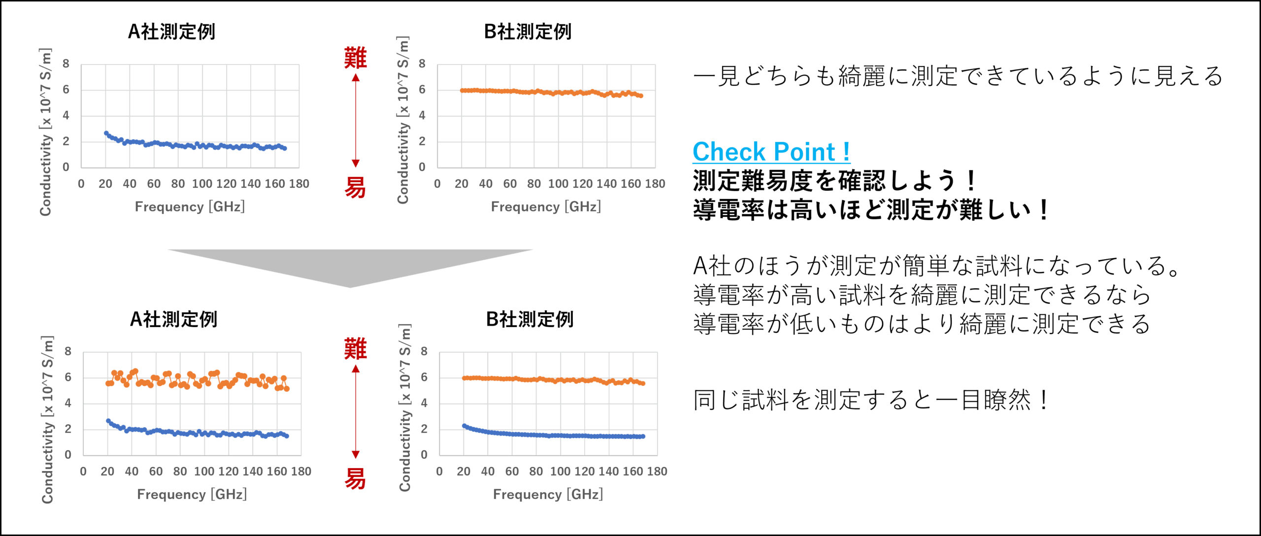 また、導電率測定の場合、導電率の高い素材のほうが測定難易度が高く、周波数が高い方が測定難易度が高いです。導電率が約3.5x10^7 S/m(比導電率にして0.6)以上がきちんと測れる装置であるか、しっかりと確認しましょう。
